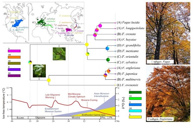 水青冈属(Fagus L.),也称山毛榉属,全球共11种,是北半球落叶阔叶林最典型的成分之一,也是我国亚热带地区山顶落叶阔叶林的主要建群成分。该属物种木材坚硬、树姿优美,具有极为重要的生态、经济和科研价值。伟德亚热带生物多样性实验室研究人员采用28个单、低拷贝核基因重建了世界水青冈属系统发育关系,并阐明其分布区形成历史。该研究为水青冈属进化生物学和生态学研究提供了一个准确的系统发育框架,也为这类植物资源的保护和利用奠定了坚实的理论基础。