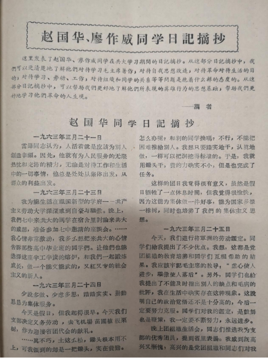 1963年3月24日:“少说多做、少虑多思、踏踏实实、勤勤恳恳为集体服务。今天是假日,但我起得很早。今天我们支部决定义务劳动,去飞机场苗圃植板栗树,作为迎接省团代会的献礼...这样的团日我觉得很有意义,虽然是假日牺牲了一点时间,但我觉得很愉快,因为这能为集体做一件好事,能为国家多植一株树,同时培养了我们的集体主义思想。”