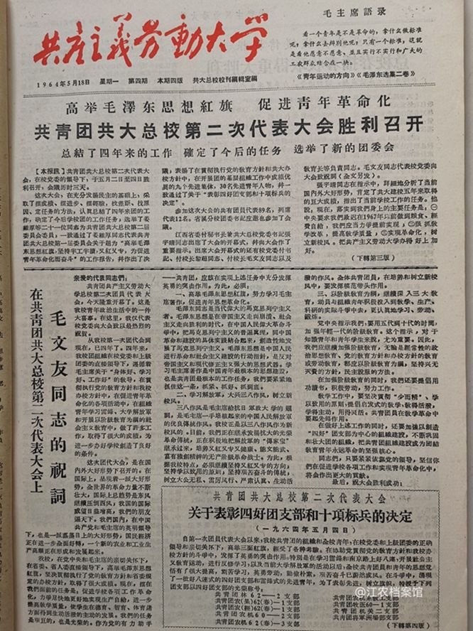 1960年5月4日,共青团共产主义劳动大学总校首届代表大会隆重开幕。出席大会的有各系团总支、支部的团员代表142人,部分分校团委同志及首次评选为全校“五好学生”和“红旗班”的代表列席了大会。