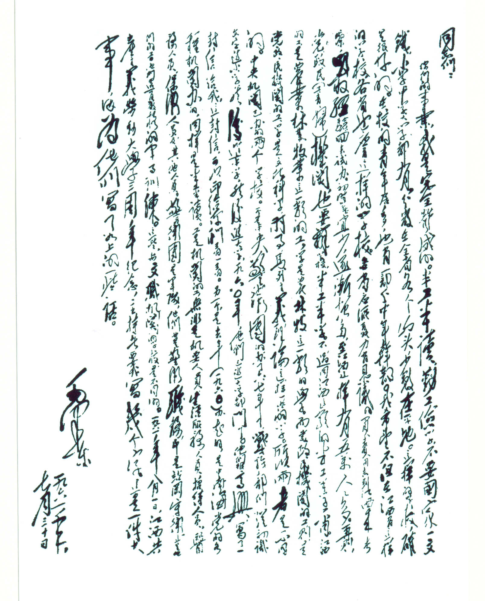 同志们:你们的事业我是完全赞成的。半工半读,勤工俭学,不要国家一文钱,小学、中学、大学都有,分散在全省各个山头,少数在平地。这样的学校确是很好的。在校的青年居多,也有一部分中年干部。我希望不但在江西有这样的学校,各省也应有这样的学校。各省应派有能力有见识的负责同志到江西来考察,吸取经验,回去试办。初时学生宜少,逐渐增多,至江西这样有五万人之多。再则党、政、民(工、青、妇)机关也要办学校,半工半学。不过同江西这类的半工半学不同。江西的工,是农业林业牧业这一类的工,学是农林牧这一类的学。而党政民机关的工,则是党政民机关的工,学是文化、科学、时事、马列主义理论这样一些学,所以两者是不同的。中央机关已办的两个学校。一个是中央警卫团的,办了六七年了,战士干部们从初识文字进小学、然后进中学,然后进大学,1960年,他们已经进大学部门了。他们很高兴,写了一封信给我,这封信,可以印给你们看一看。另一个是去年(一九六O年)办起的,是中南海的党的各种机关办的,同样是半工半读。工是机关的工,无非是机要人员生活服务人员招待人员,医务人员,保卫人员及其他人员。警卫团是军队,他们也是警卫职务,即是站岗守卫,这是他们的工。他们还有严格的军事训练。这些,与文职机关的学校是不同的。一九六一年八月一日,江西共产主义劳动大学三周年纪念,主持者要我写几个字。这是一件大事,因为他们写了如上的一些话。