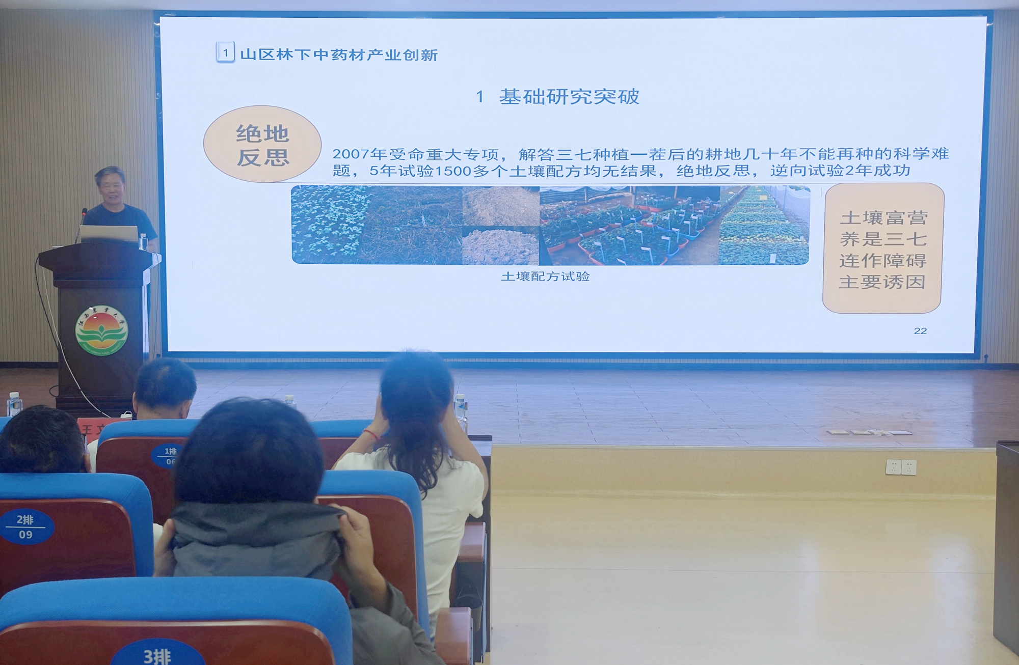 朱有勇以“一个‘农民院士’的科研经历”为主题,围绕三条主线“启蒙:一道不会回答的考题;求索:一条艰辛探索的道路;回归:一篇写在大地上的论文”,生动讲述了自身从农民到“农民”院士的科研经历,分享了从脱贫攻坚再到粮食安全主战场上如何靠科技创新,把科研工作转化为服务百姓看得见的生产力,形成了“生物多样性:山区林下中药材;生境多样性:河谷冬季马铃薯;遗传多样性:半山区旱地水稻”等特色科技成果和成果转化成功案例。最后,朱有勇以“人倦了,天远了,唯有山水相依。守候着那束透过红城的梯田之光”,鼓励广大青年科技工作者和大学生,要坚定理想信念,持之以恒,守住科研工作者的诗和远方。