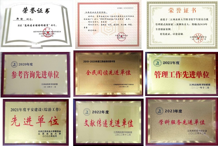 多年耕耘,硕果累累,图书馆工作得到学校师生高度认可,以馆长郑瑜获得全国榜样馆员为代表,一大批馆员获得各级各类表彰奖励,图书馆也先后获得了中国图书馆学会、CALIS全国农学文献信息中心、江西省图书馆学会、江西省高校图工委等上级机构的肯定和表彰。五年来,吸引了武汉大学、西北农林科技大学等省内外近80余家院校到馆参观交流。