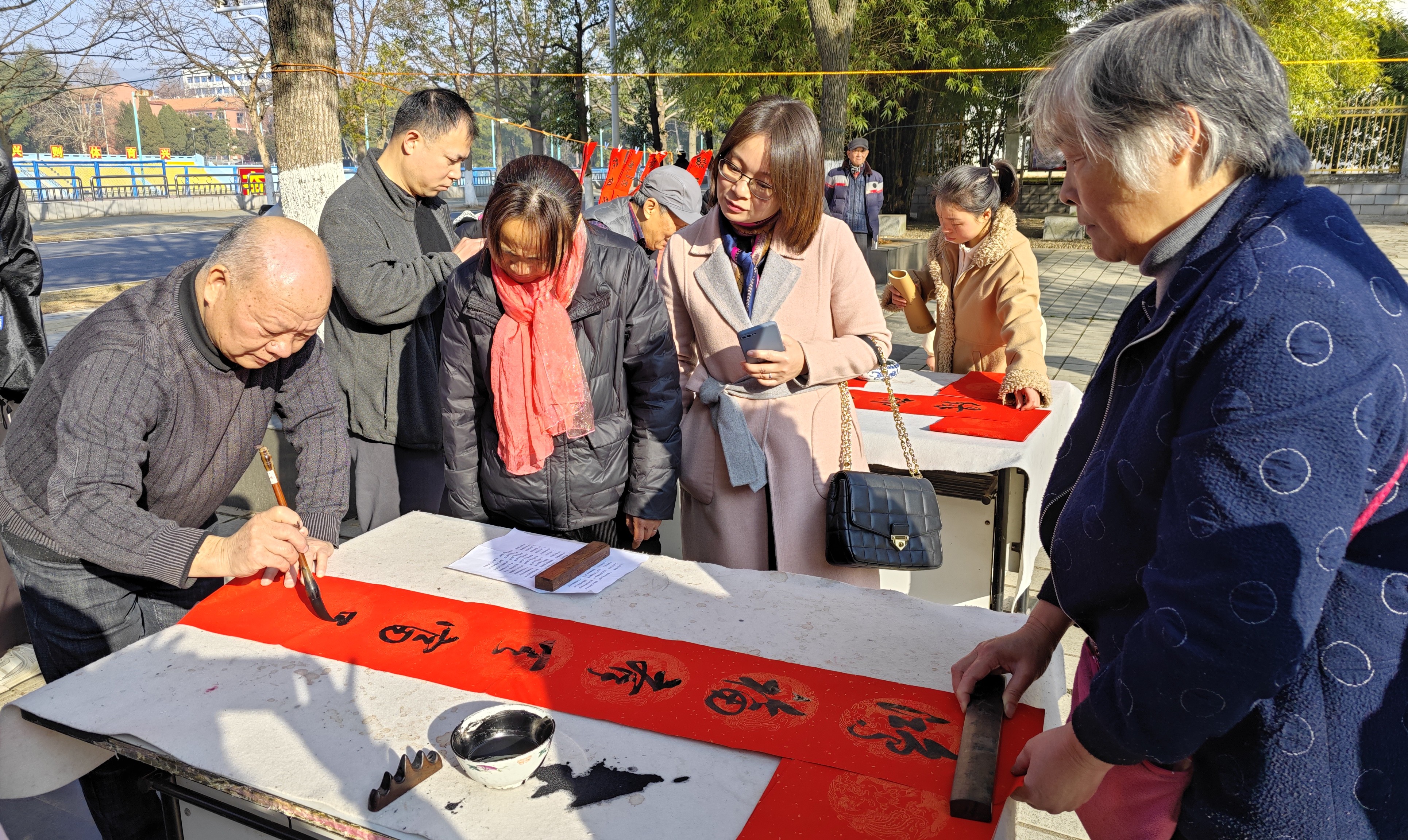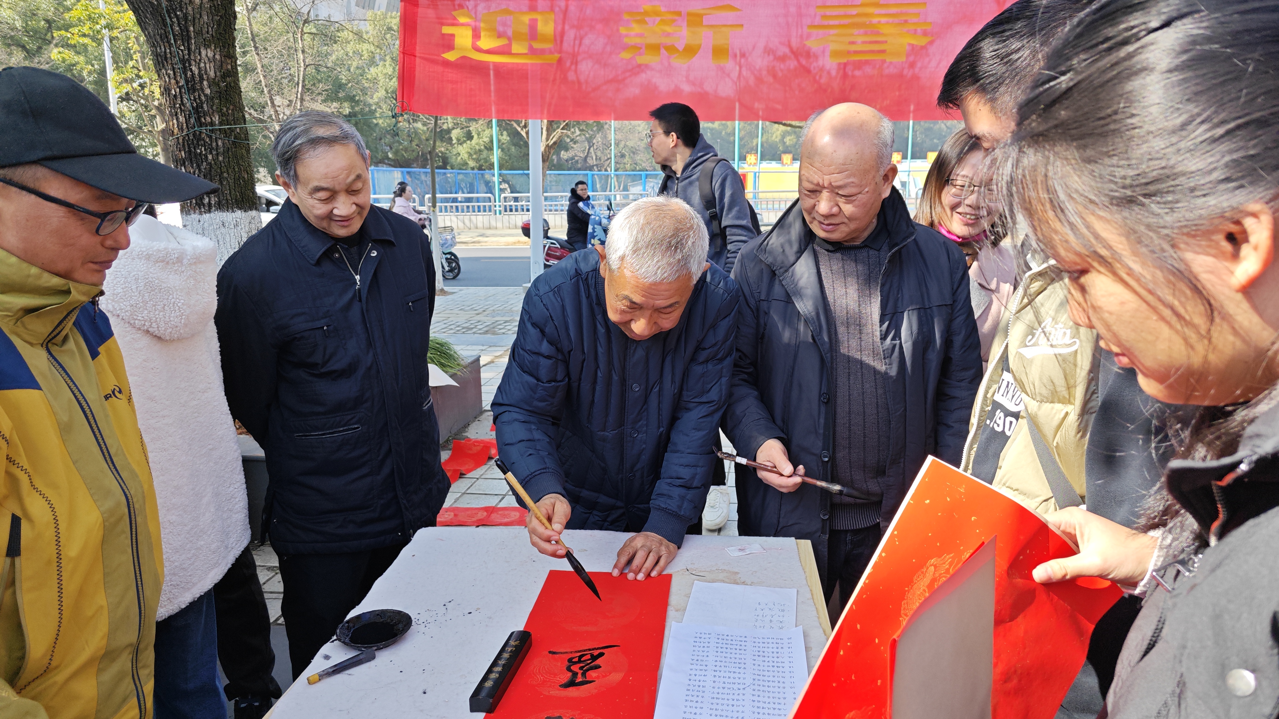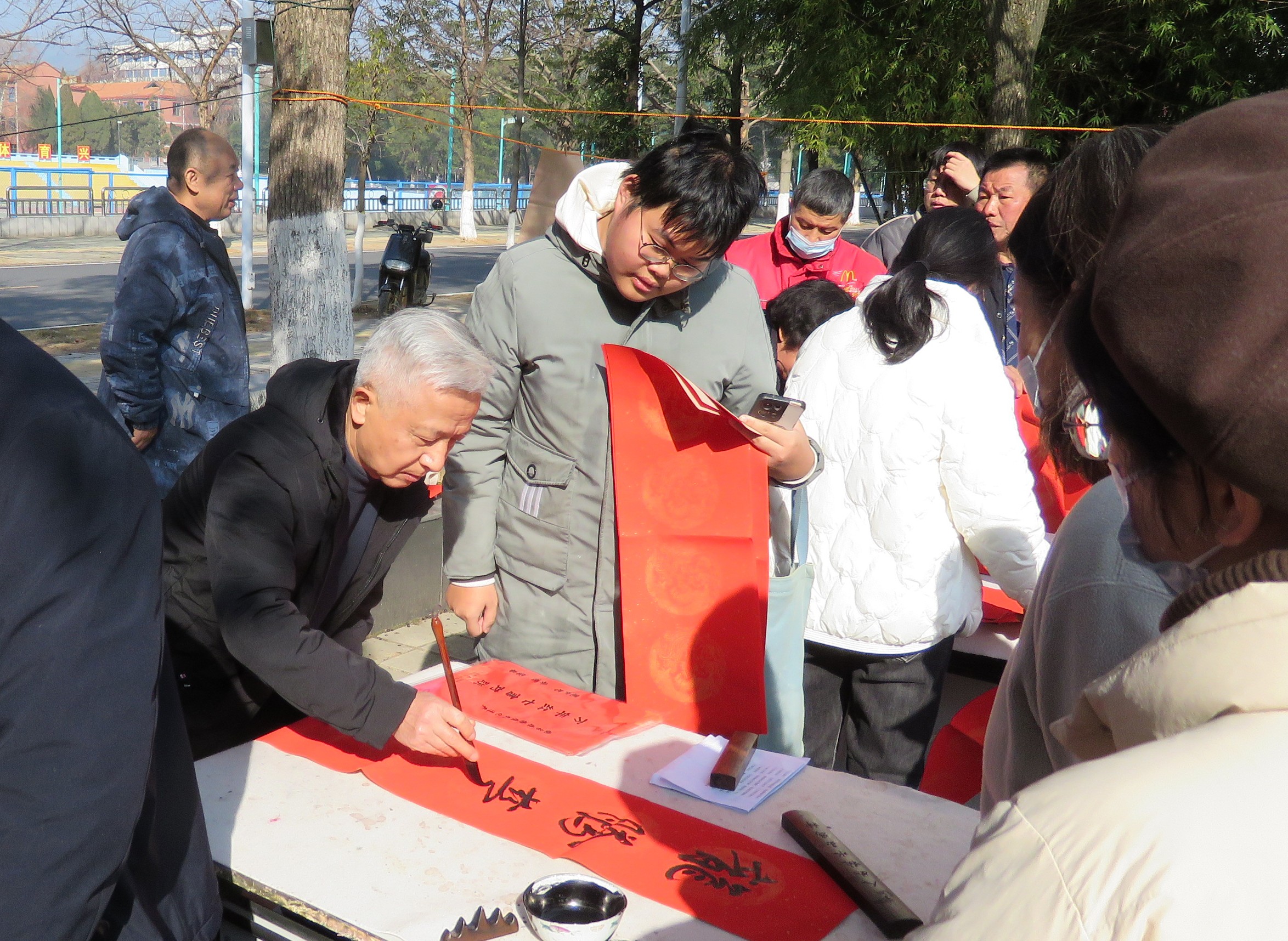 活动现场冬日暖阳,墨香飘溢,气氛热烈,前来领取春联的师生络绎不绝。校书画协会的10余位书法爱好者各展所长,充分满足师生的需求,共为师生写送春联1000余幅。