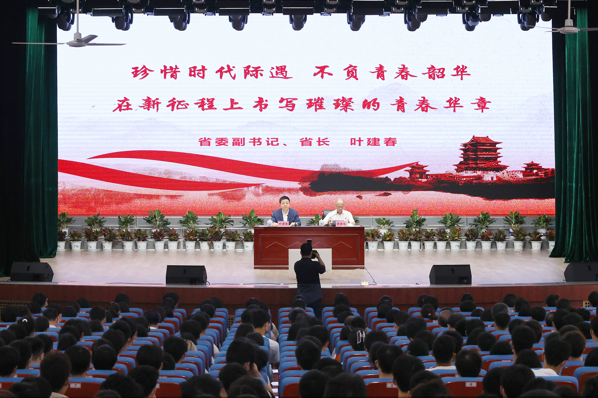 叶建春围绕经济实力实现历史性跃升、党的建设实现历史性加强、中国之治实现历史性完善、人民生活实现历史性跨越、维护国家安全能力和国际影响力实现历史性提升五个方面,系统回顾了新时代10年的非凡历程,引导青年学生深刻领悟“两个确立”的决定性意义,增强志气底气骨气,更加自信自立自强,始终紧跟习近平总书记、奋进新征程、建功新时代。叶建春说,新时代的江西呈现出“风景这边独好”的盛世图景,经济发展量质双升,改革开放步履铿锵,生态环境首屈一指,人民生活节节登高,红色基因薪火相传,希望大家更多关注江西、了解江西,更加情系江西、扎根江西,为现代化江西建设注入澎湃动能。他指出,大学阶段正值最美的青春年华,希望大家志存高远、脚踏实地、勇于探索、修身律己,自觉把人生抱负同强国建设、民族复兴结合起来,把“读万卷书”与“行万里路”结合起来,为推进农业农村现代化、推进红色基因传承等贡献力量,在报效祖国、服务人民中书写无悔青春。