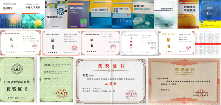 推进教育教学内涵式发展,突出金课引领,实现省级教学竞赛新突破。学院倾心打造规划教材体系,体现农林特色,出版教材20部,有《普通化学》《有机化学》《分析化学》《仪器分析》《有机合成化学》《应用化学专业英语》等。学院顶层设计一流课程体系,突出金课引领,建设完成省级金课6门次,有江西省研究生优质课程“高等环境化学”、江西省精品在线开放课程“环境化学”和“普通化学”、江西省线上线下混合式一流课程“环境化学”和“现代仪器分析”、江西省高校育人共享计划课程“环境化学”等;建设校级金课11门次,有“有机化学”“物理化学”“定量分析化学”“生活中的化学”“有机化学实验”等。学院持续推进教育教学改革,落实创新实践,主持省级教研项目17项和校级9项;指导大学生创新创业项目国家级13项,省级3项和校级25项;荣获江西省教学成果奖2项,校级教学成果奖7项;荣获第二届江西省教学创新大赛正高组二等奖和第五届江西省本科院校青年教师教学竞赛理科组二等奖1项、三等奖2项,实现省级教学竞赛新突破。
