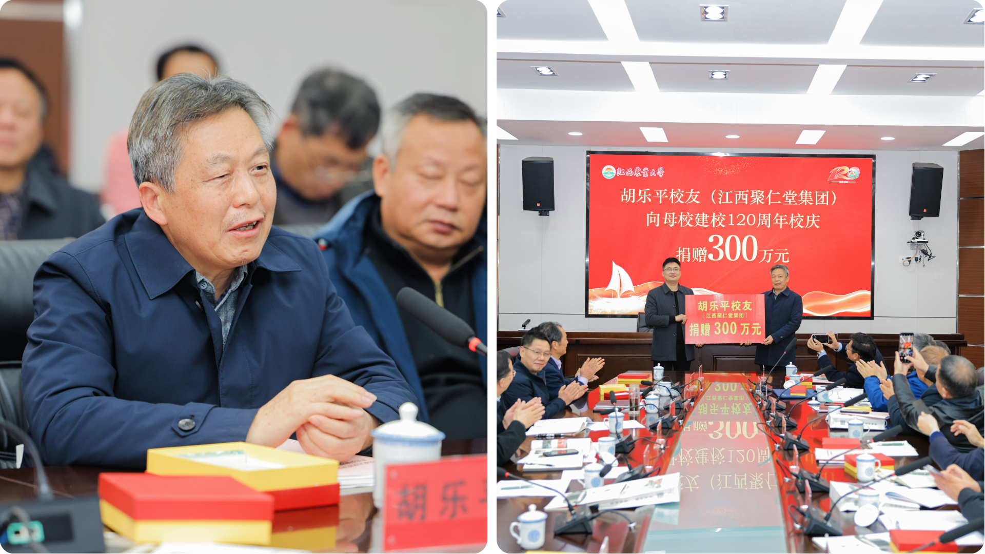 会议举行了校友捐赠签约仪式,江西聚仁堂集团董事长、江西校友会会长胡乐平向母校捐赠人民币300万元。胡乐平在发言中深情回顾了在校学习的难忘岁月,介绍了毕业后几十年的奋斗历程,感恩母校老师的精心培养以及事业发展过程中的关心指导。他表示,自己始终牢记母校校训,努力践行母校精神,勤奋努力,担当责任。今日捐赠旨在以己之力,抛砖引玉,期望能吸引更多校友将关注的目光聚焦母校建设,汇聚各方力量助力学校发展。