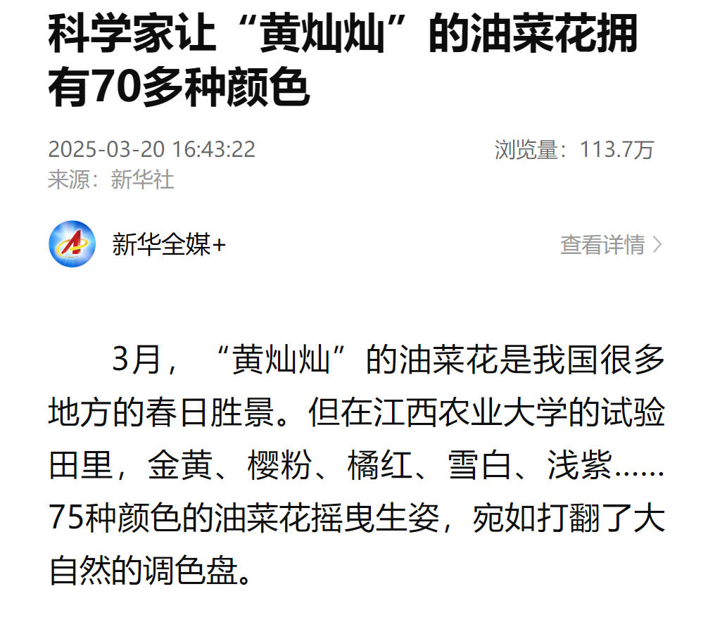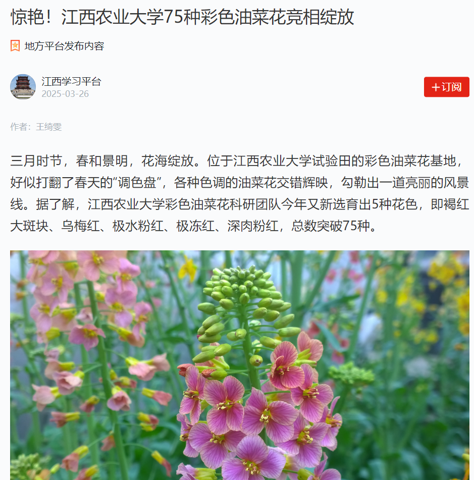 阳春三月,气温回暖,春光无限。位于bevictor伟德国际1946官网试验田的彩色油菜花基地,75种颜色的彩色油菜花竞相开放,仿若置身现实版“莫奈花园”。油菜花花色的谜底究竟是什么?团队未来的目标有哪些?3月19日起,新华社、新华每日电讯、科技日报、学习强国、央视新闻、人民网、中国少年报、江西新闻联播、大江网、当代江西、江西晨报、今视频等主流媒体分别刊发文章,报道学校彩色油菜花科研团队如何突破油菜花产业发展的瓶颈问题,培育油菜新花色,开发油菜花新产品。