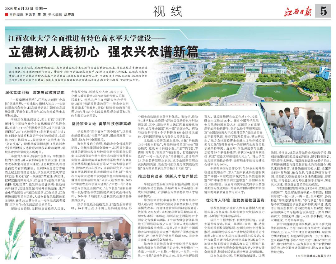 6月23日,《江西日报》以“立德树人践初心,强农兴农谱新篇”为题专题专版报道伟德全面推进有特色高水平大学建设成效,全文如下: