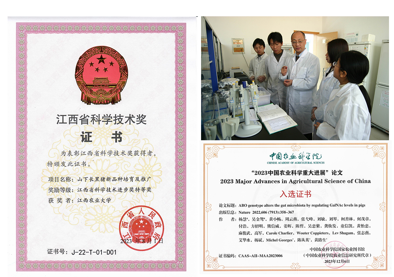 聚焦科技自立自强,构建农业全领域科研矩阵。依托生猪领域全国唯一、江西首个独立组建的猪遗传改良与种质创新全国重点实验室,以及教育部作物生理生态与遗传育种重点实验室、鄱阳湖流域森林生态系统保护与修复国家林草局重点实验室等53个部省级创新平台,持续攻关核心技术。在前沿研究上,“揭示猪血型基因影响肠道菌群组成的机制”“首次在国际农业动物中发现宿主基因组影响肠道菌群的因果基因突变”分别入选2022年、2023年“中国农业科学重大进展”。“中芯一号”猪育种芯片实现全面国产化,“山下长黑”猪新品种等一批标志性科技创新成果成为农业科研标杆。2024年,2项技术入选我国农业主导品种主推技术。