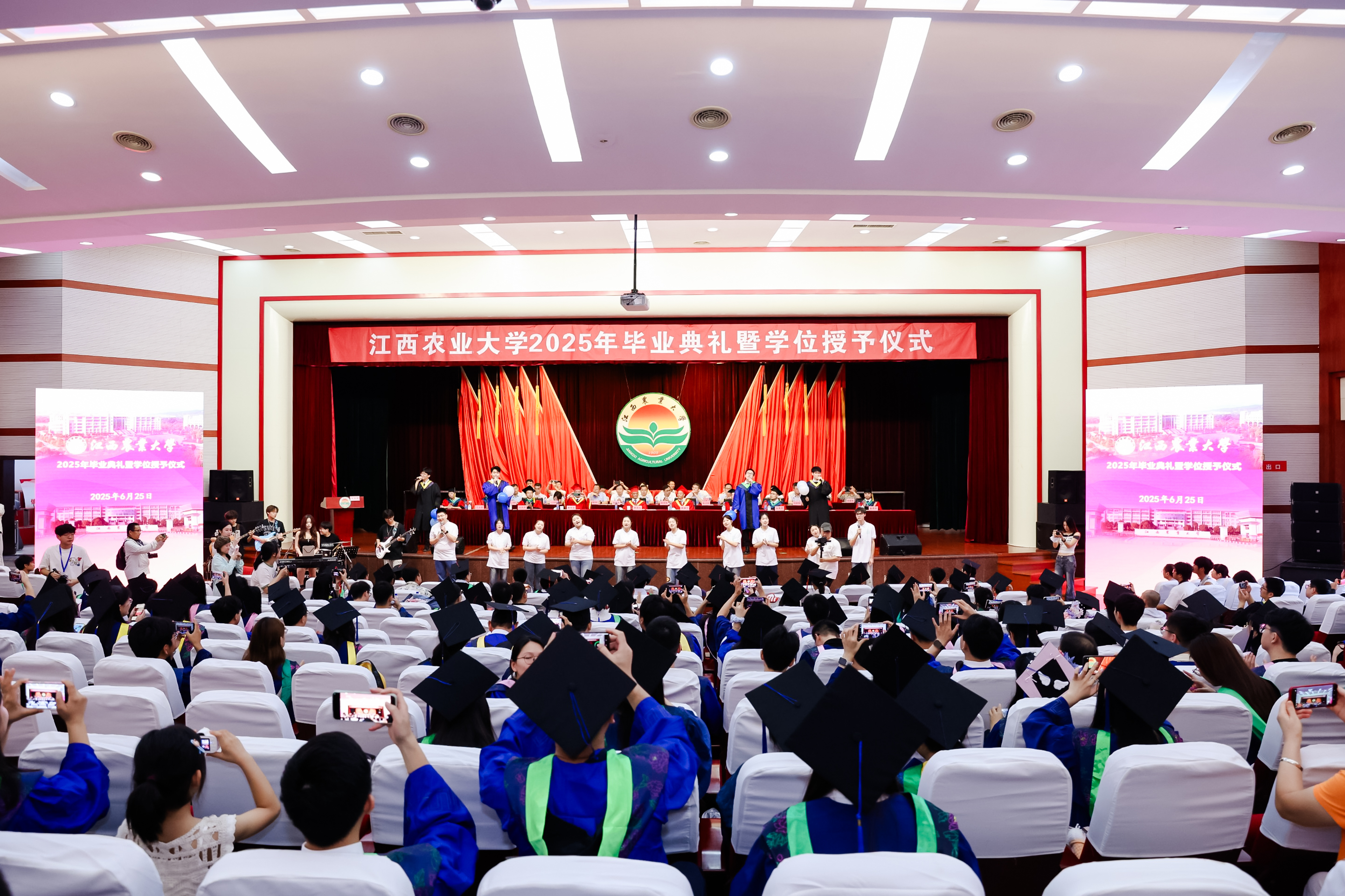 今年的毕业典礼,电子大屏闪耀着每一位走上台的毕业生姓名,每一位同学的名字响彻礼堂,母校以此为毕业生们加油、壮行。在现场,毕业生代表、在校生代表共同演唱《凤凰花开的路口》《世界赠与我的》《奉献》《夜空中最亮的星》《送别》等歌曲,为2025年毕业生献上最美好的祝福!
