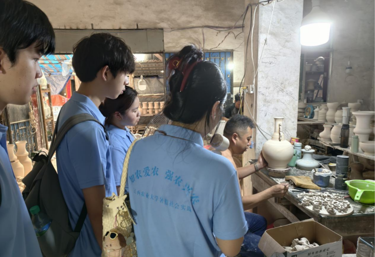 在景德镇罗家坞古法作坊,动科院“瓷韵承古,麂影护珍”实践队队员们沉浸式体验了拉坯、印坯、精修、绘釉等核心工序,在泥土与釉彩的缠绵交织间,队员们体验了一堂鲜活灵动的非遗传承实践课。