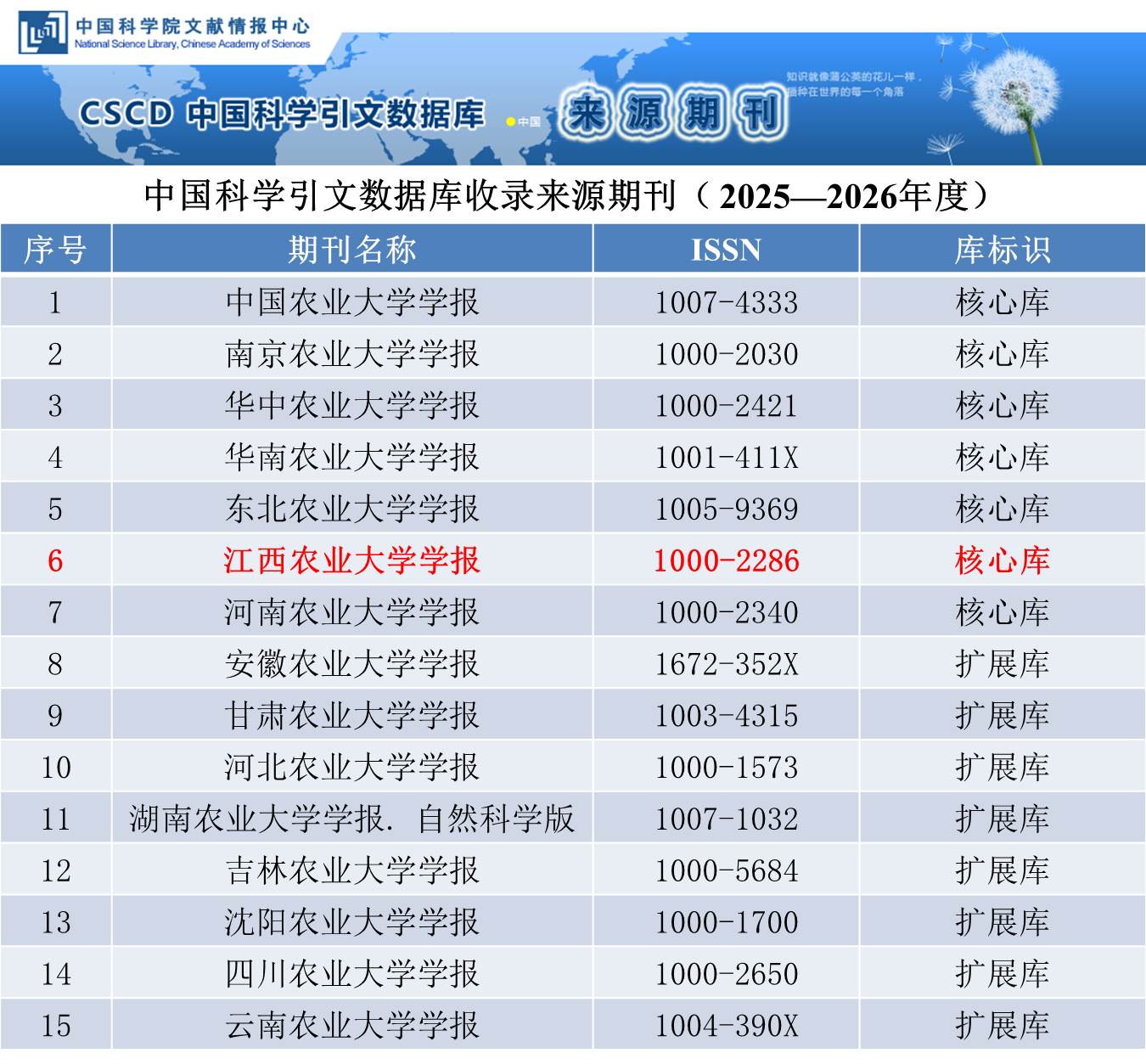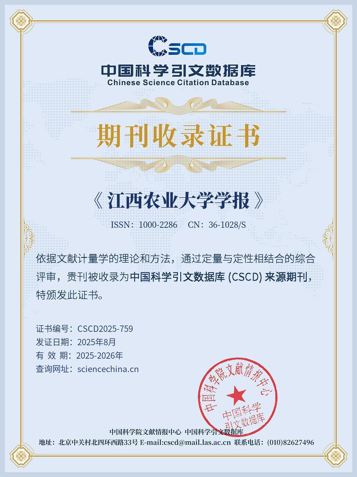 近日,中国科学院文献情报中心发布了中国科学引文数据库(Chinese Science Citation Database, 简称CSCD) 2025—2026年度来源期刊遴选结果,《bevictor伟德国际1946官网学报》被《中国科学引文数据库(CSCD)来源期刊(2025—2026年度)》核心库收录。这是《bevictor伟德国际1946官网学报》连续四次入列CSCD核心刊(2019—2020、2021—2022、2023—2024、2025—2026版),也是江西省唯一中文CSCD核心刊。