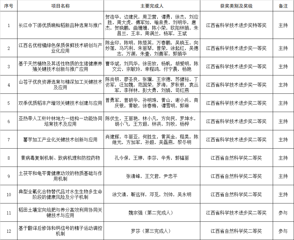 日前,江西省人民政府发布了关于2024年度科学技术奖励的决定,伟德12项科技成果获奖,获奖项目数量和一等奖以上奖项创历史新高,居全省前列。其中,作为第一完成单位(完成人)获特等奖1项、一等奖3项、二等奖6项;作为参与单位获二等奖2项。