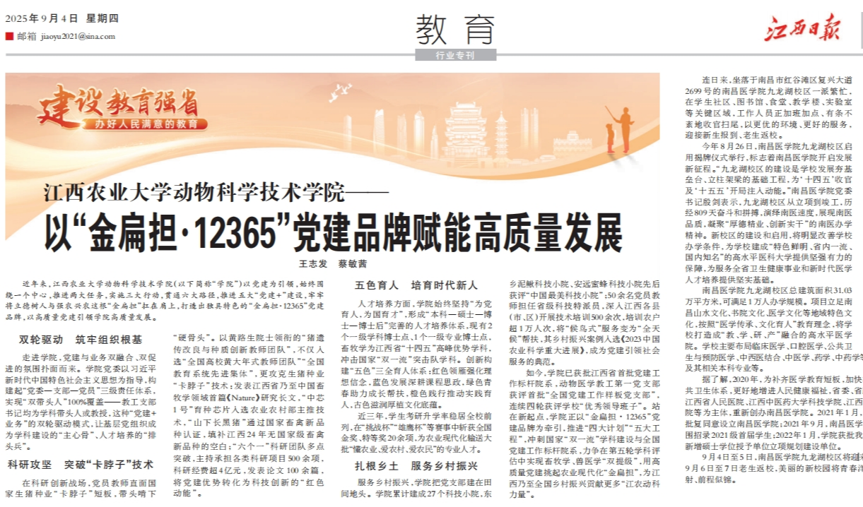 9月4日,《江西日报》以“以‘金扁担·12365’党建品牌赋能高质量发展”为题,专题报道伟德动物科学技术学院“金扁担·12365”党建品牌建设成效,全文如下:
