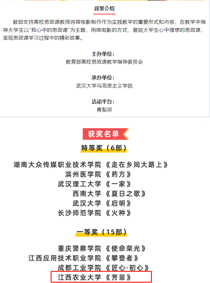 近日,由教育部高校思政课教学指导委员会主办、武汉大学马克思主义学院承办的第六届“我心中的思政课”全国高校大学生微电影展示活动评选结果揭晓,伟德报送的微电影作品《芳菲》在全国高校推送的1684部作品中脱颖而...