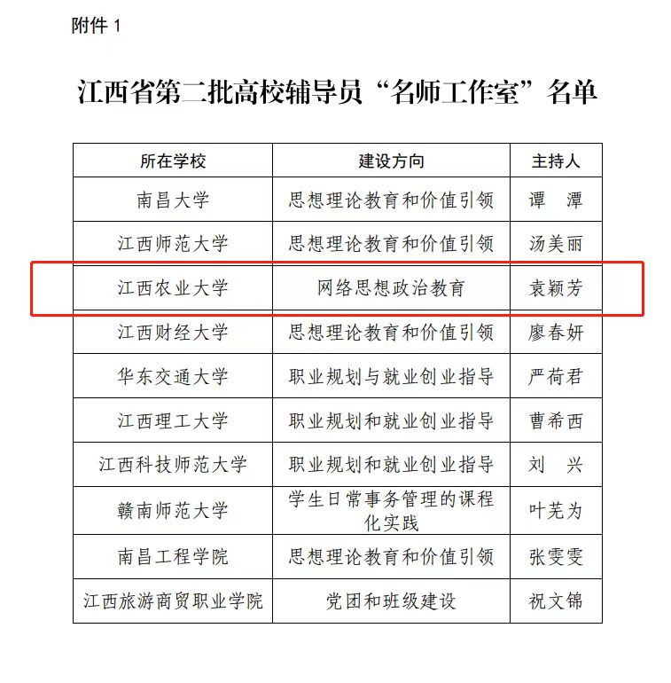 近日,江西省教育厅印发了《关于公布江西省第二批高校辅导员“名师工作室”的通知》,经个人申报、单位推荐、专家评审、结果公示,伟德辅导员袁颖芳主持的“缘来有你”辅导员工作室获批江西省高校辅导员名师工作室。...