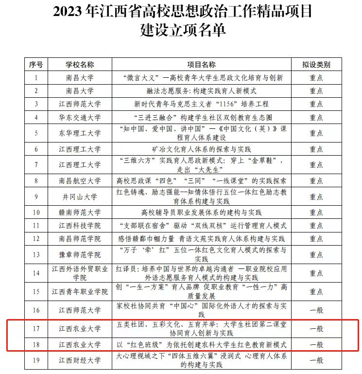 近日,江西省教育厅印发了《关于公布2023年江西省高校思想政治工作精品项目建设立项名单的通知》,伟德项目《五类社团、五彩文化、五育并举:大学生社团第二课堂协同育人创新与实践》与《以“红色班级”为依托创建农...