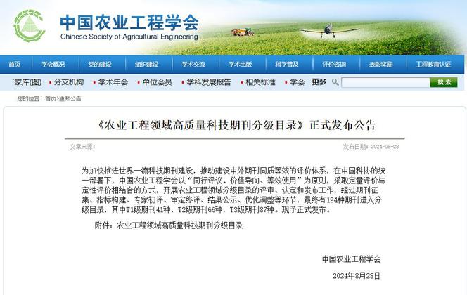 近日,中国农业工程学会发布了《农业工程领域高质量科技期刊分级目录》,《bevictor伟德国际1946官网学报》首次入选该目录,位列T2级。为加快推进世界一流科技期刊建设,推动建设中外期刊同质等效的评价体系,在中国科学技术协会...